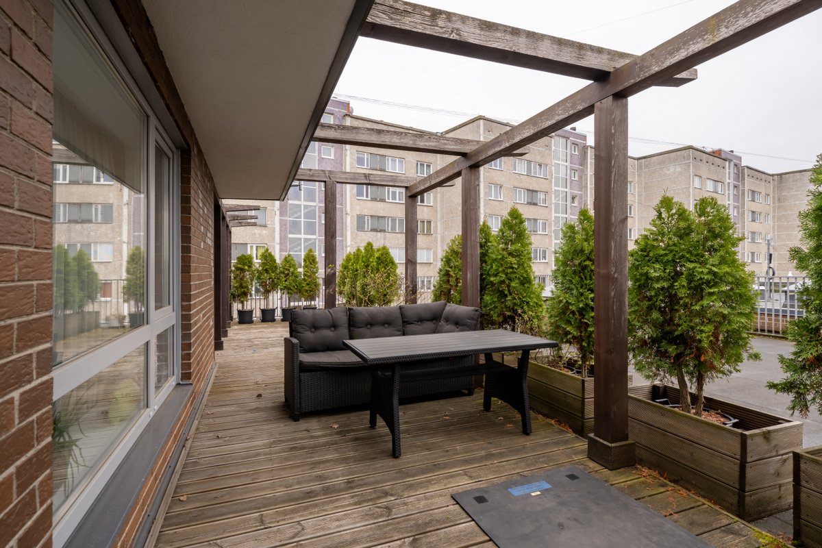 Vienīgais divstāvu dzīvoklis šajā projektā, kas piedāvā privātumu un pat mājas sajūtu, pateicoties plašajai terasei. Terase atrodas dienvidu pusē, nodrošinot daudz saules un siltuma, turklāt veiksmīgais plānojums un apkārtējās ēkas pasargā to no aukstiem vējiem.